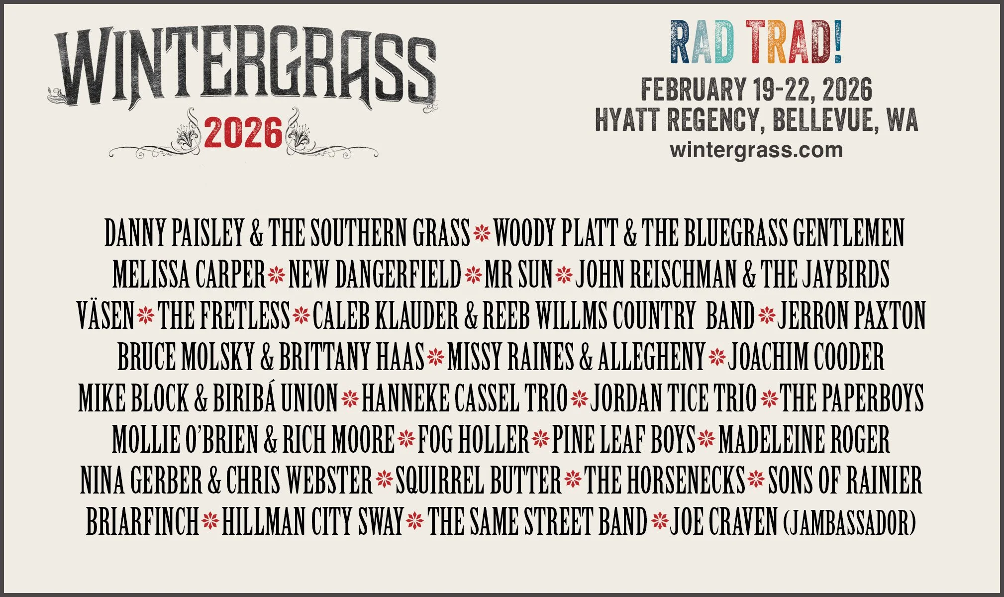 Biribá Union is back on tour this spring, and we're playing at the incredible WINTERGRASS Festival in Bellevue, WA, on February 19 and 21! Accompanied by the wonderful bass sub, Claire Davis, we'll be playing alongside all these amazing musicians.