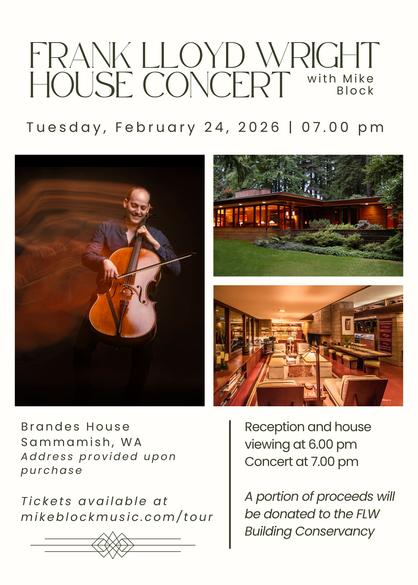 I'm so excited to be performing at a new Frank Lloyd Wright house in a few weeks! This intimate house show will take place at the gorgeous Brandes House in Sammamish, WA, on Tuesday, February 24. Due to venue size, ticket availability is strictly limited, so secure your spot while you can!