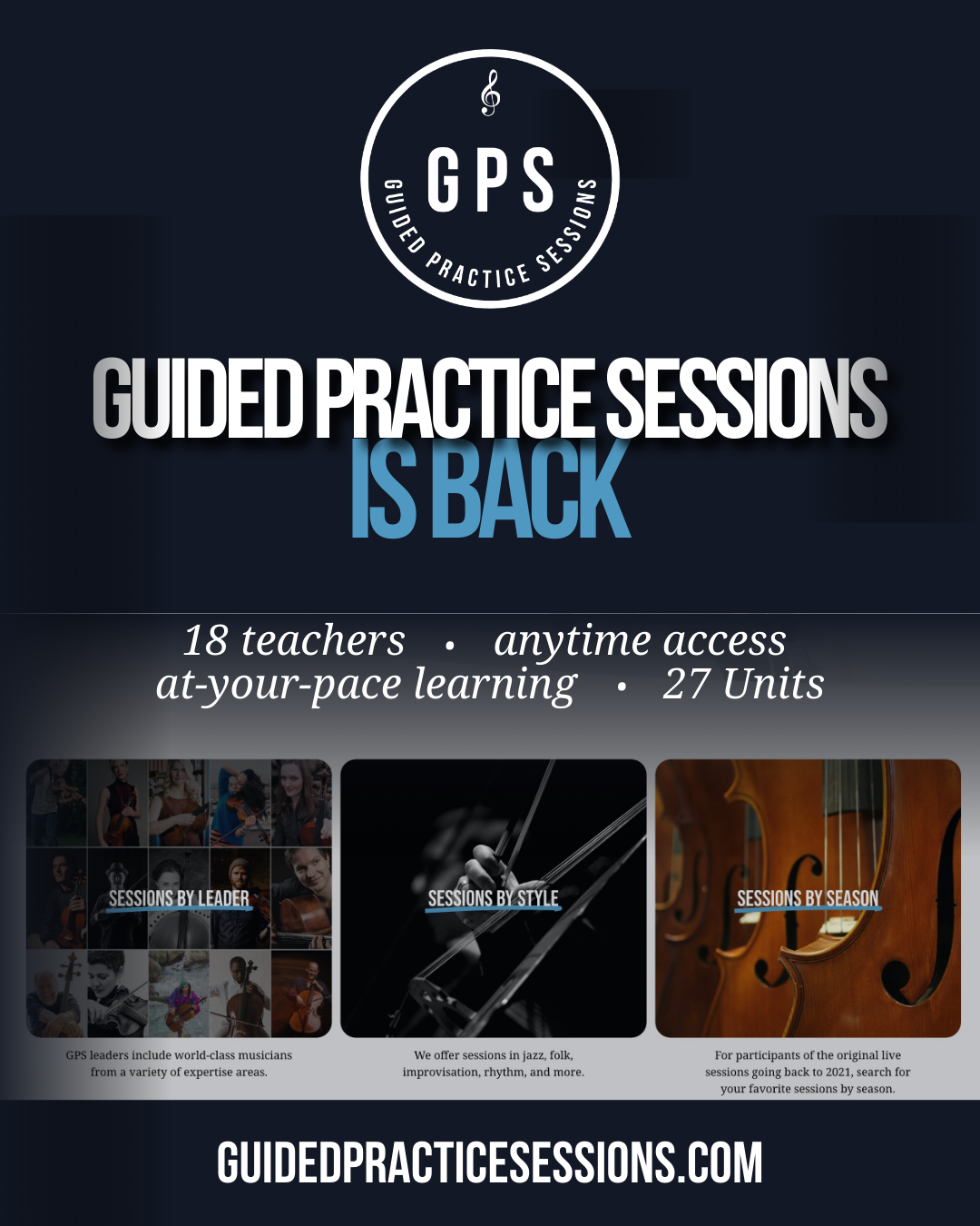 Guided Practice Sessions is BACK! GPS aren’t typical workshops, but more like a regular group class at the gym, or a Peloton workout for musicians interested in non-classical styles, techniques, and improvisation! :) GPS was a pandemic activity from 2021-2023, with sessions led by some of the most creative string musicians around, and now we've got a NEW website with the whole archive reorganized and ready to access! If you are a string player with a New Year Resolution to "practice more", or "get better at XXX", or "make time to be more creative", then JOIN US! We're celebrating the relaunch with one other LIVE Guided Practice Session exploring improvisation with me via ZOOM on Jan 11 at 4 pm EST!